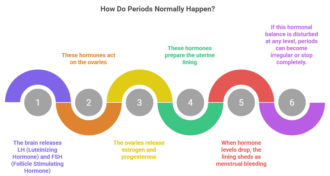 If this hormonal balance is disturbed at any level, periods can become irregular or stop completely.
